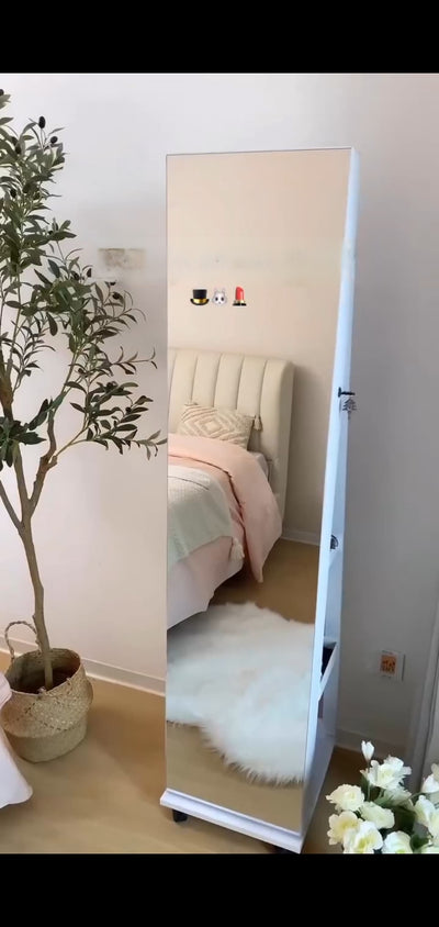 Full-length Mirror Jewelry Cabinet, SimpleWise Lockable Jewelry Organizer, Large Space Jewelry Armoire 4 Wheels 360° Rotating Floor Free Standing, with Built-in Makeup Mirror, White