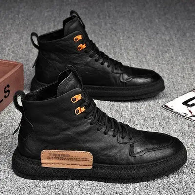 Mens Label PU High-Top Sneakers | Chunky Heel Casual Shoes in Black