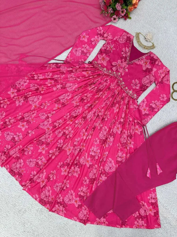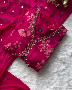 Elevate your ethnic wardrobe with this exquisite Deep Pink Floral Printed Georgette Suit Set, designed for those who love a blend of traditional charm and modern elegance. The suit features a hand-embellished mirror work neckline that sparkles beautifully under light, paired with a soft matching dupatta adorned with delicate sequin detailing. The coordinated elasticated bottoms offer comfort without compromising style, making this set perfect for festive events, special occasions, or cultural celebrations.