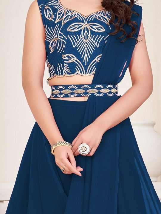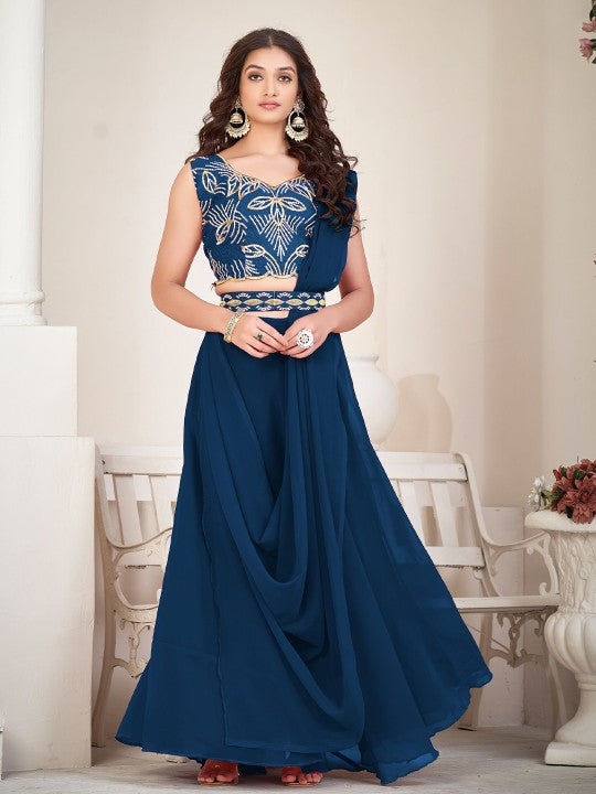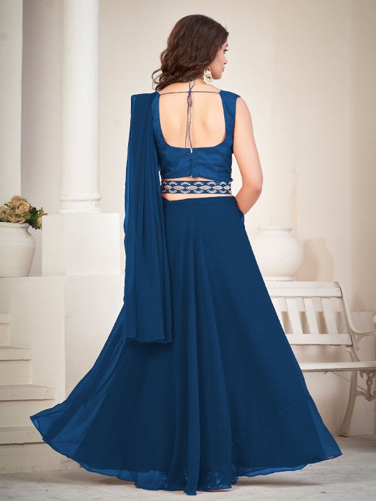 Turquoise blue and white embroidered unstitched blouse, has a round neck, three-quarter sleeves, turquoise blue and white embroidered semi-stitched lehenga, has zip closure, flared hem