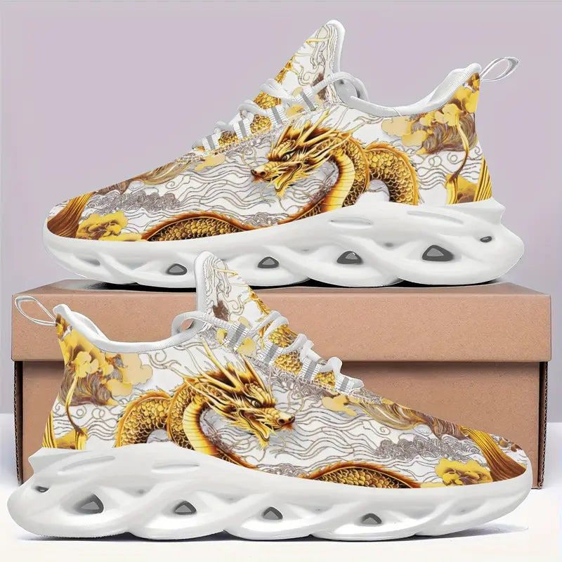 Unleash your inner fire with these dragon-themed sneakers, combining bold design with all-season performance. Featuring a striking cartoon dragon pattern, these breathable, lightweight low-top lace-up shoes are perfect for running, hiking, or everyday street style. The MD sole offers flexibility and shock absorption, while the soft fabric insole ensures all-day comfort. Built for both style and function, these sneakers are a unique fusion of fantasy flair and sporty practicality—ideal for those who dare to stand out.