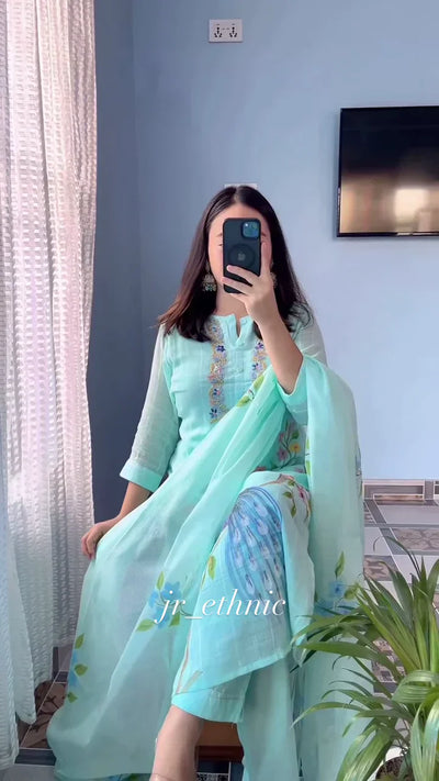 Light Blue Embroidered Kurta Set: This beautiful kurta set comes in a soothing light blue shade, featuring vibrant, colorful floral motifs that add a lively and cheerful touch to the ensemble.