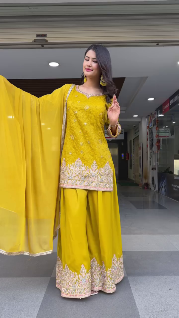 Make a bold and beautiful statement in this mustard yellow georgette kurti set, featuring intricate thread embroidery and sequin detailing. The straight kurti pairs seamlessly with matching palazzo pants and a coordinating dupatta, creating a harmonious festive look that’s ideal for weddings, parties, and traditional occasions.
