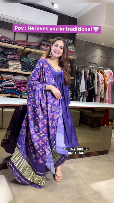 Regular price Rs. 99.00 Save Liquid error (snippets/product-template line 135): Computation results in '-Infinity'%Embrace timeless elegance with this Royal Purple Traditional Anarkali Kurta Set, thoughtfully crafted for women who cherish rich hues and artisanal details. The deep purple kurta, accentuated by a vibrant multicolor printed dupatta and gleaming Gota Patti border, flows gracefully into a flared silhouette that moves with poise. Ideal for festive celebrations, wedding ceremonies, and milestone gatherings, this ensemble combines heritage craftsmanship with contemporary comfort.